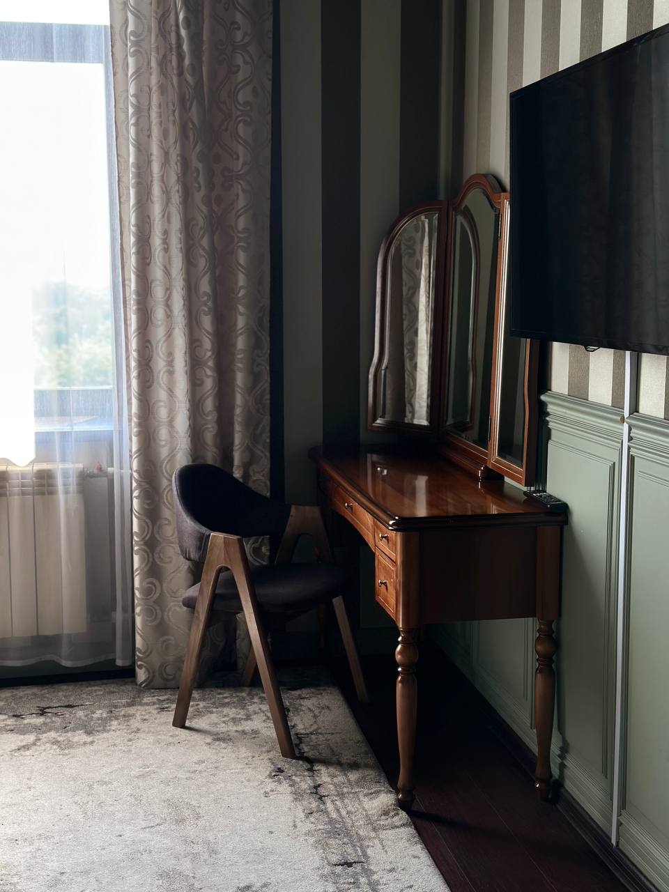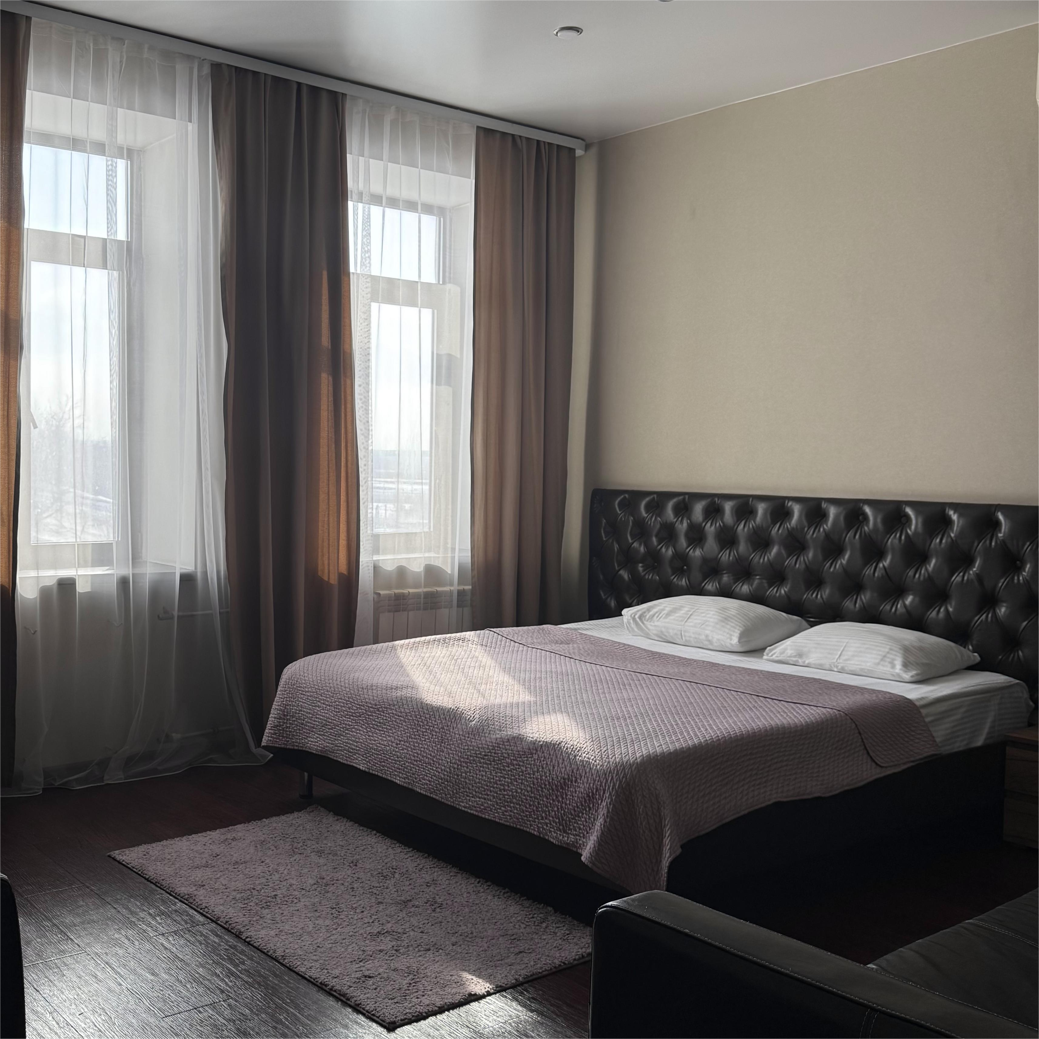 - Двуспальная кровать евро-стандарт с ортопедическим матрацем, тумбы, шкаф, стол, туалетный столик, диван;