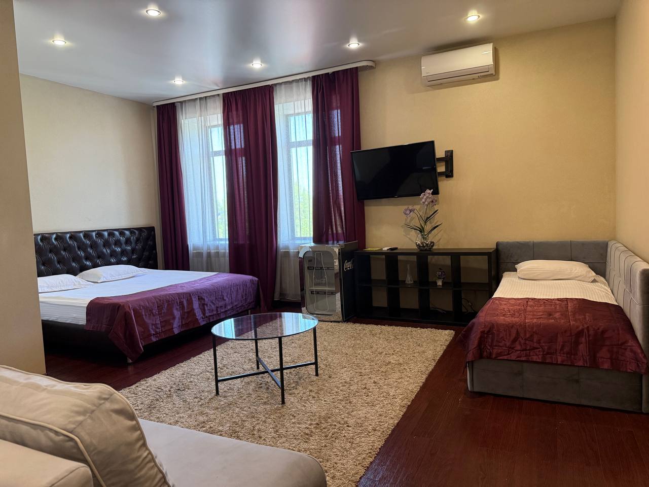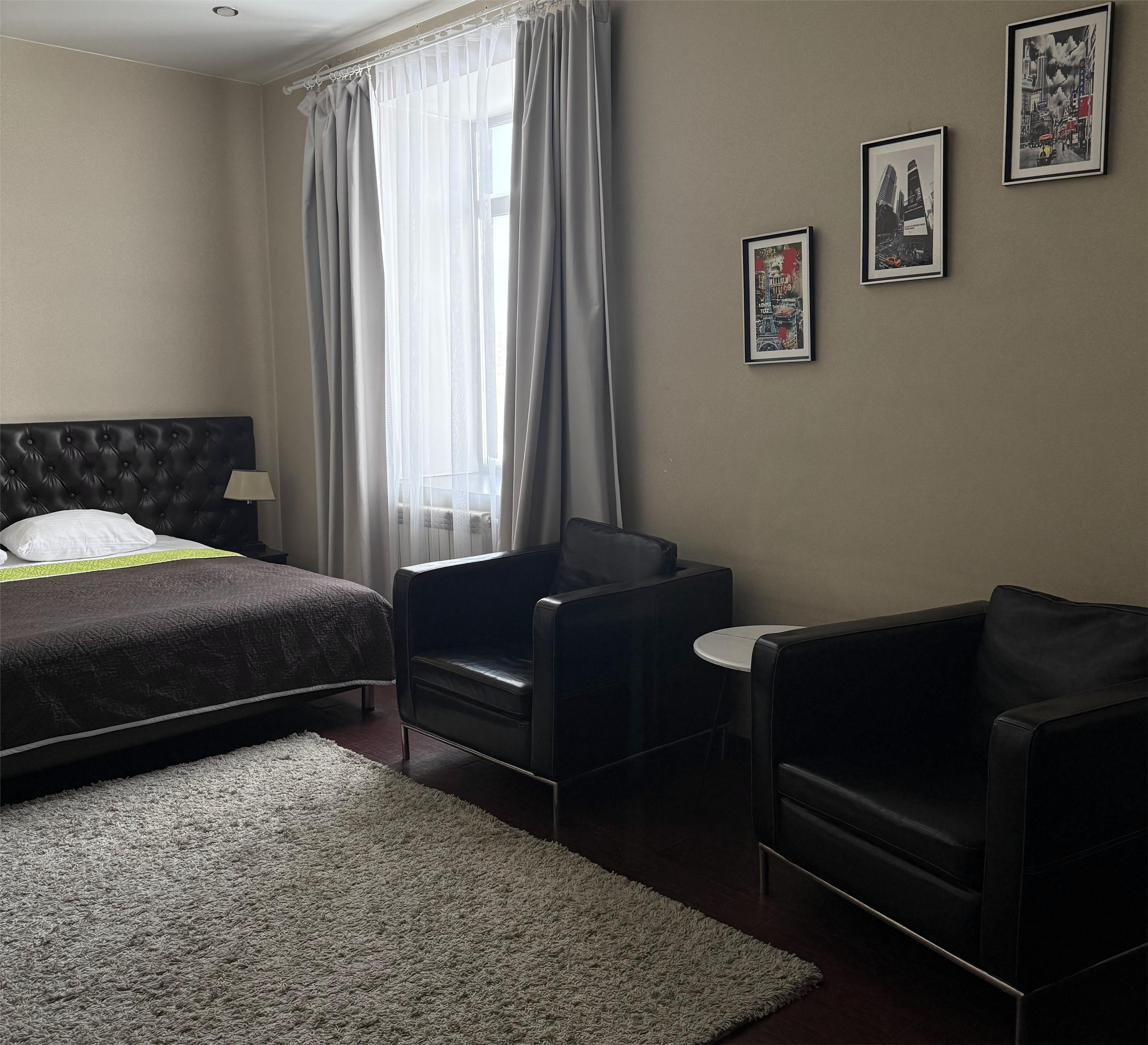 - Двуспальная кровать евро-стандарт с ортопедическим матрацем, тумбы, шкаф, стол, туалетный столик, диваны;
