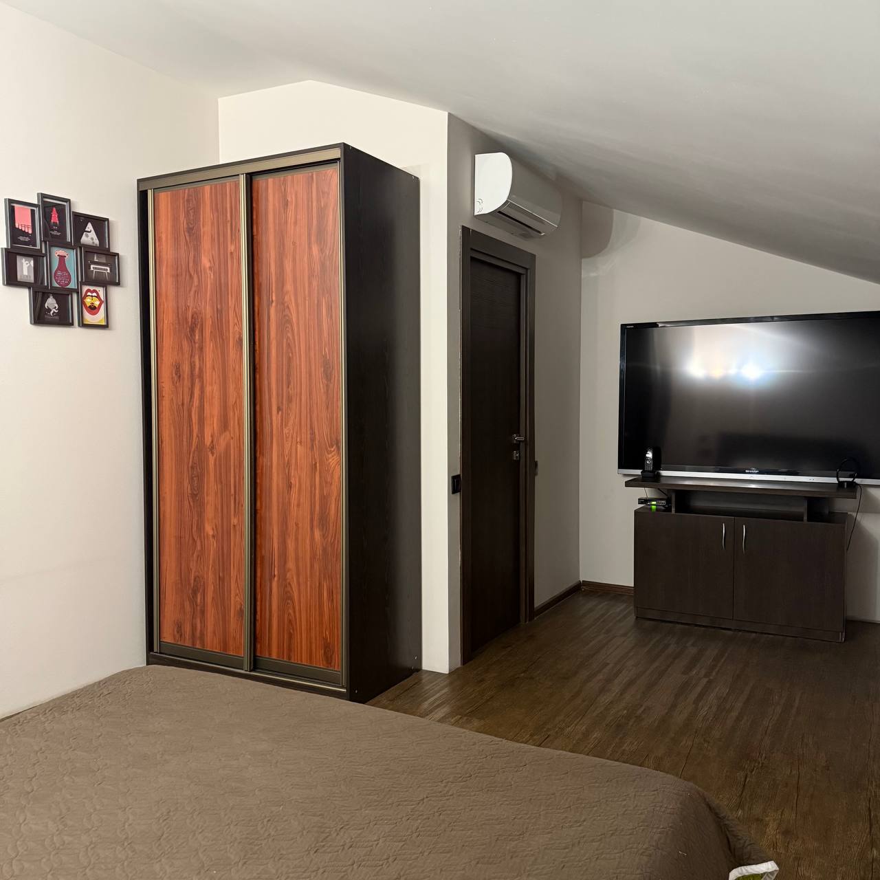 - Двуспальная кровать с ортопедическим матрацем, тумбы, шкаф, стол;